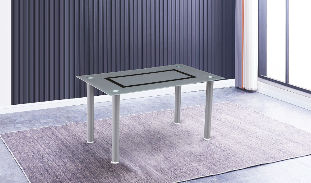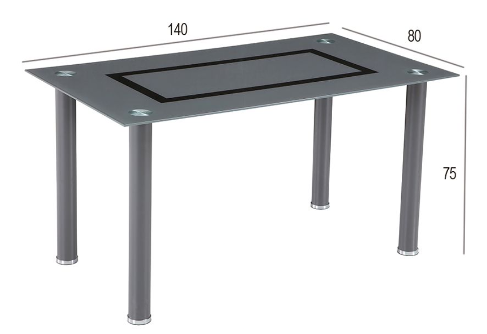 La mesa de comedor es el verdadero punto focal del conjunto, con una encimera de cristal templado gris ahumado que incorpora un diseño decorativo geométrico en tonos oscuros, aportando un aire minimalista y vanguardista. Las esquinas están decoradas con aplicaciones metálicas circulares, reforzando la estética moderna y añadiendo estabilidad visual al conjunto. Las patas cilíndricas metálicas, de acabado cromado, ofrecen una base firme y elegante que complementa a la perfección el diseño del sobre.