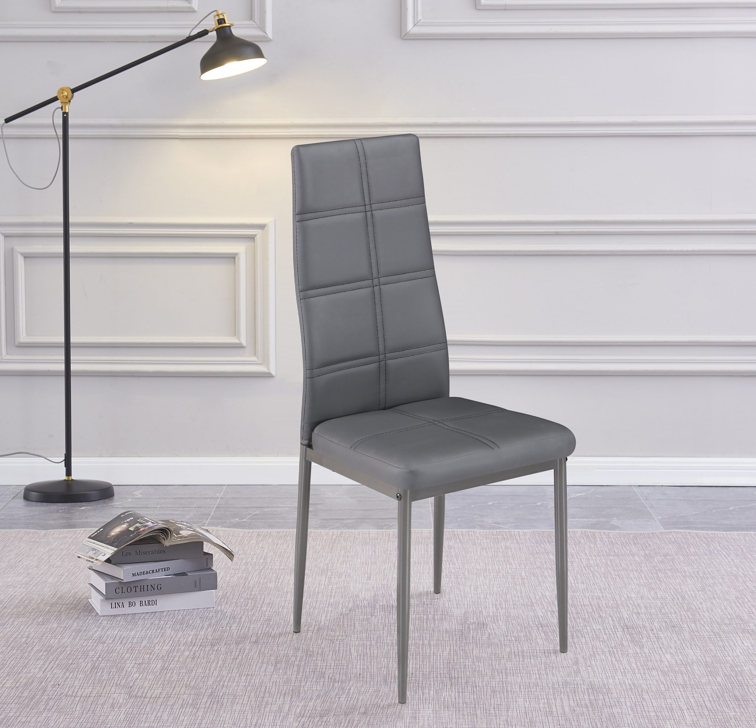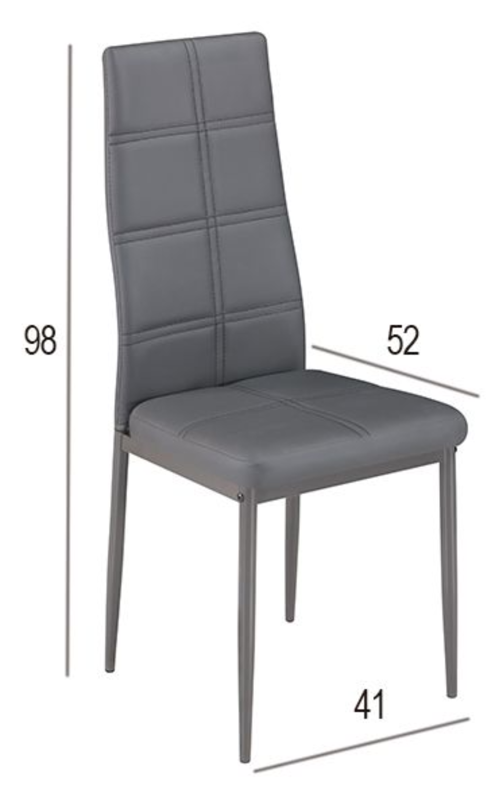 Acompañando la mesa, el conjunto incluye seis sillas tapizadas en símil piel gris grafito, con respaldo alto y líneas verticales acolchadas que proporcionan un excelente soporte y confort durante las comidas. Su estructura metálica en acabado mate garantiza solidez, mientras que el diseño estilizado y ergonómico de las sillas las convierte en una opción cómoda tanto para el uso diario como para ocasiones especiales.